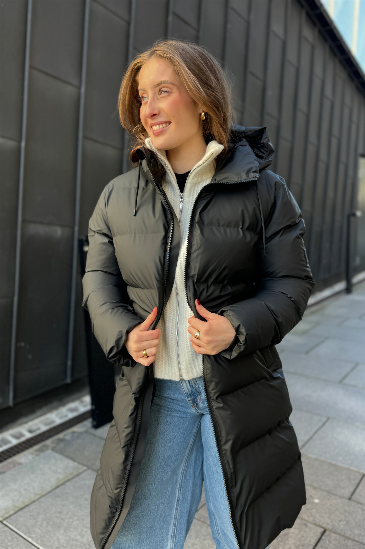 Alta Longer Puffer Jacket W3T4 fra Rains. Alta Longer Puffer Jacket W3T4 er en funksjonell og stilig vinterjakke som gir optimal beskyttelse mot både kulde og vind. Denne vanntette vinterjakken har en lengere silhuett og er laget med Rains' signatur PU-stoff som beskytter mot regn, mens den isolerte hetten med snøring gir ekstra varme og komfort. Jakken er designet med doble sveisede sømmer og har en to-veis belagt glidelås med hakebeskyttelse, som sikrer en værbestandig og holdbar lukking.