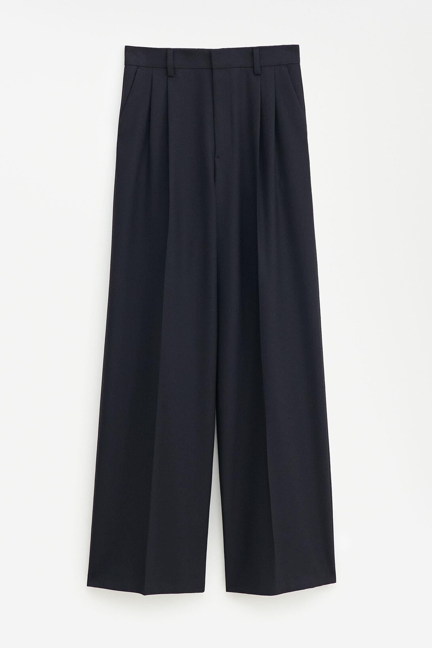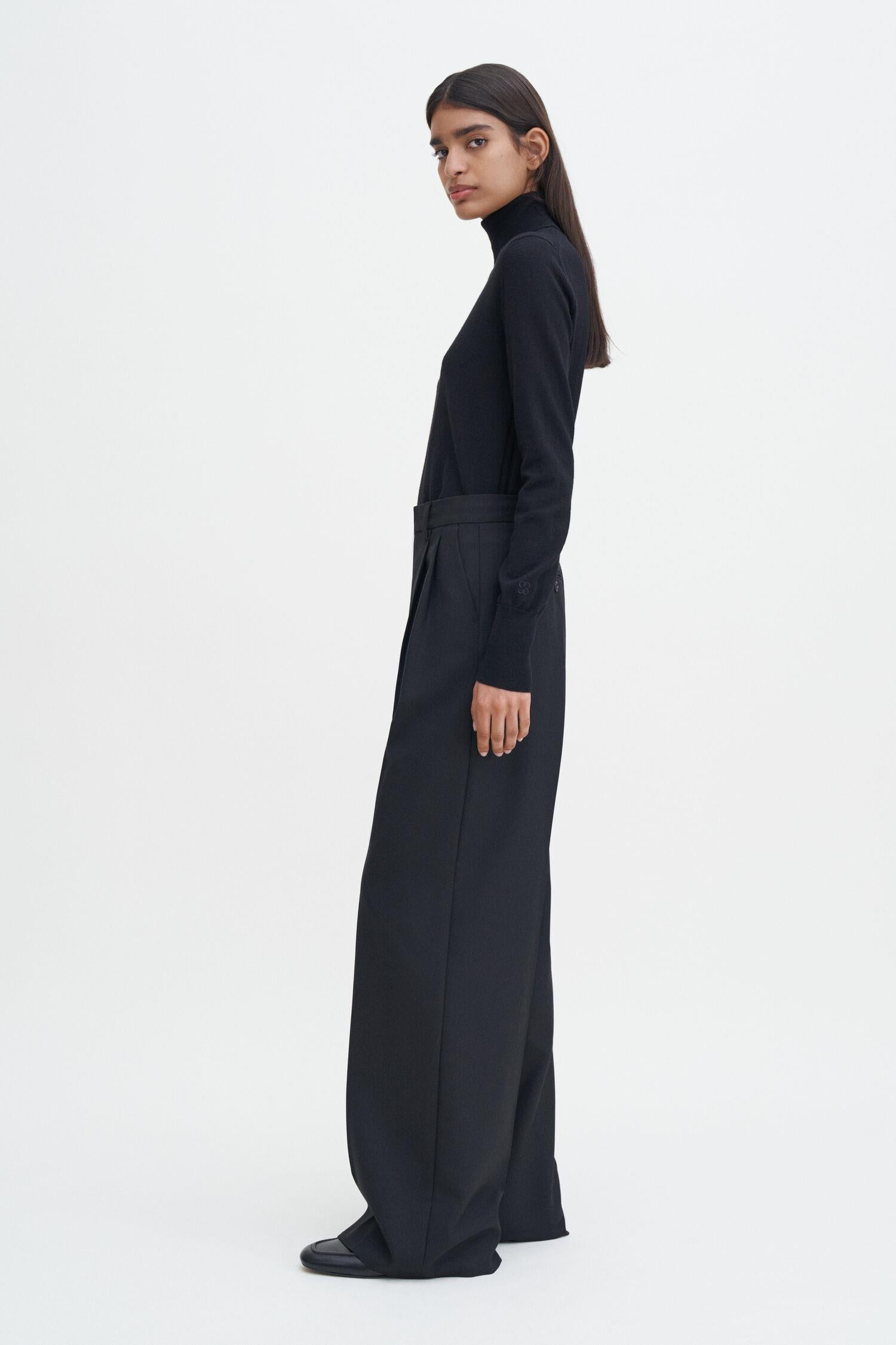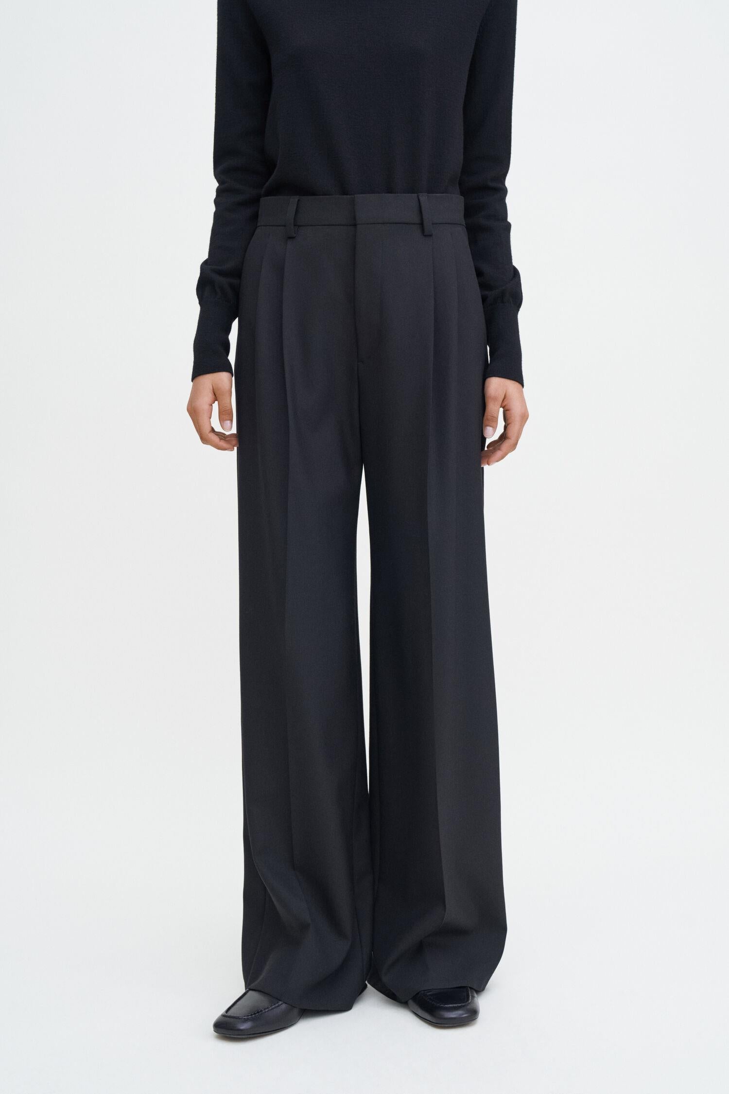 Darcey wool trousers fra Filippa K. Darcey wool trousers i black er skreddersydd fra en mellomvekts ullblanding med lett stretch. Designet med en høyt tilpasset midje, voluminøse folder og en generøs bred benform med ekstra lang lengde.