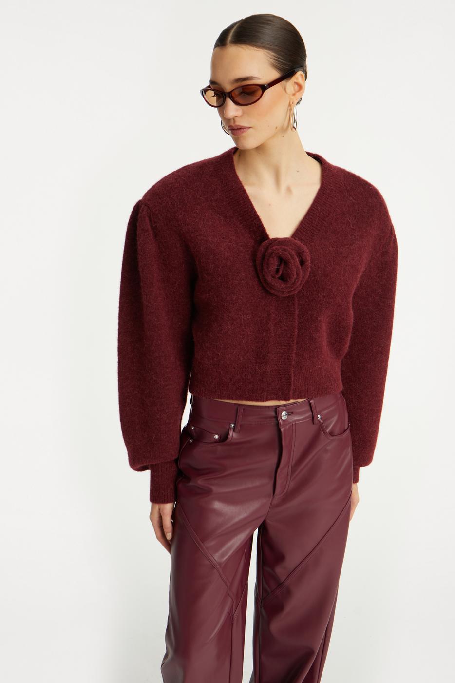 Knit Puffsleeve Cardigan fra Rotate er en feminin og leken cardigan som setter prikken over i-en i garderoben. Cardiganen kommer i en nydelig burgunderfarge, med puffede ermer og en dekorativ rosebrosje i samme nyanse som gir plagget et eksklusivt preg. Knit Puffsleeve Cardigan fra Rotate er litt kort i lengden og passer perfekt over en kjole, med high waist jeans eller skjørt for å skape en balansert og elegant silhuett.