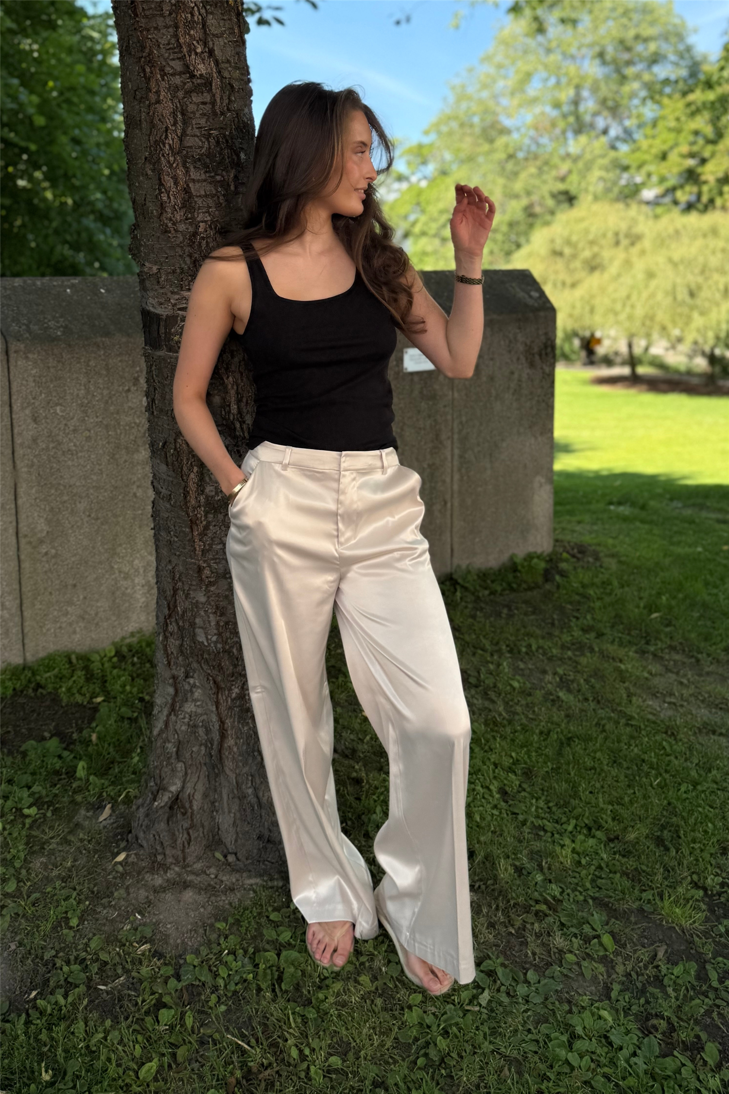 Reign Satin Tailored Extra Wide fra Iben. Vi elsker denne satengbuksen i krem.