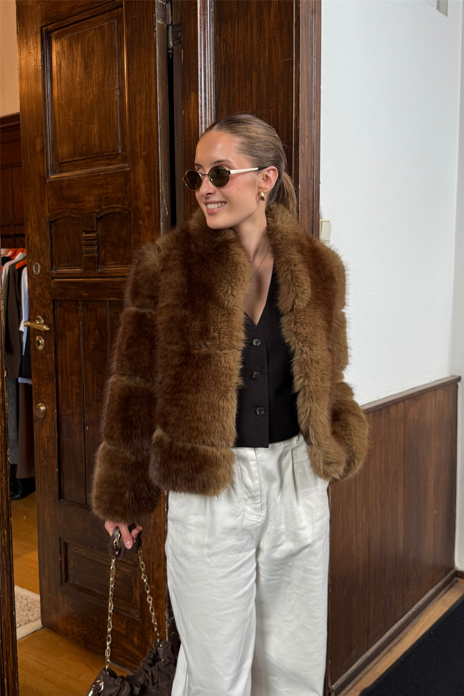 Posh Short Coat fra Iben er en elegant og tidløs fuskepels som gir antrekket ditt et eksklusivt uttrykk. Den korte fasongen gjør den enkel å style både til hverdag og fest, mens den myke, brune faux fur-kvaliteten tilfører varme og luksus. Diskré hekter foran og skjulte sidelommer gir et rent og sofistikert snitt. En statement-jakke som løfter hele garderoben og holder deg stilsikker gjennom sesongen.