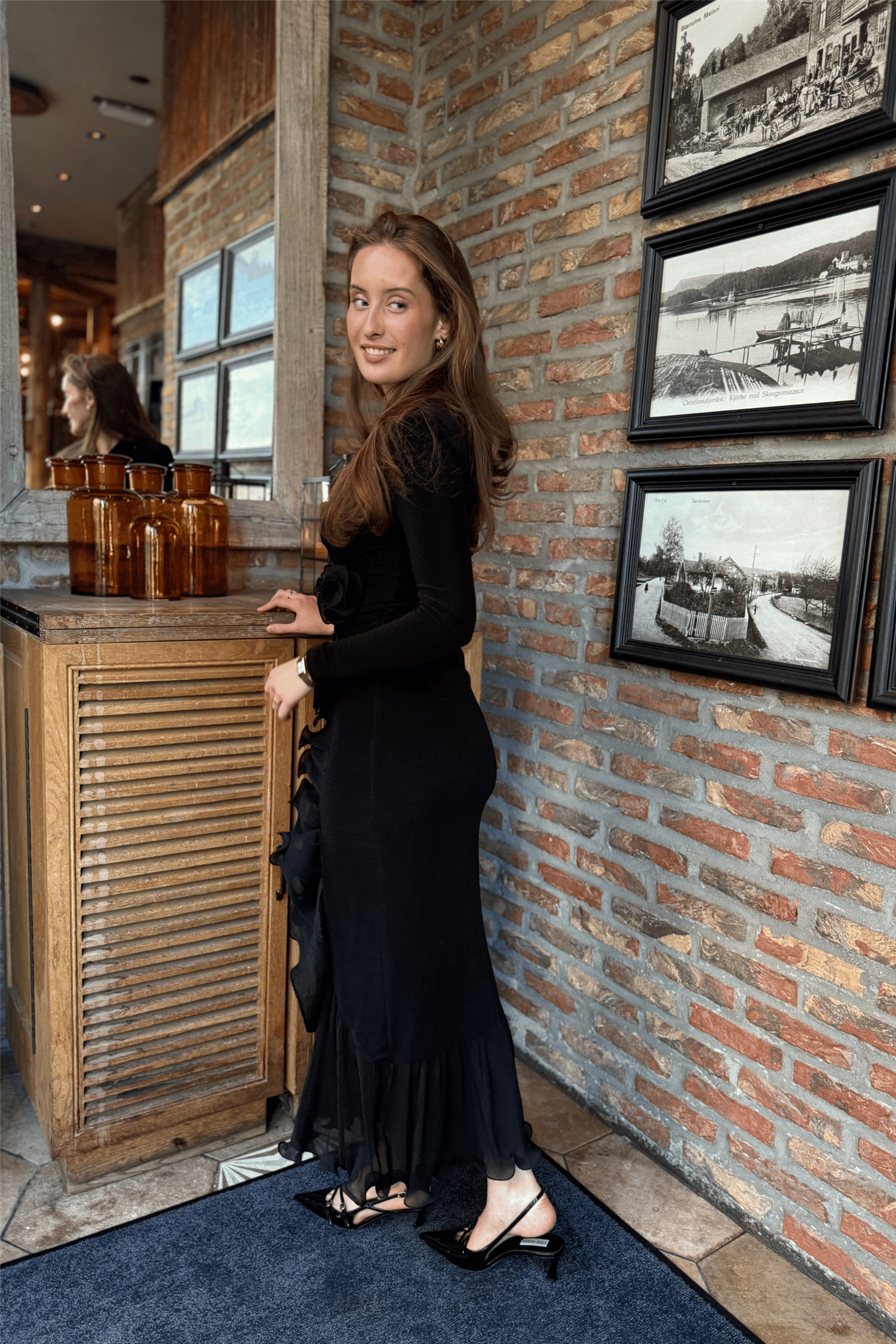Dion Dress fra RAVN RAVN. Elegant sort maxikjole med omslagseffekt og dramatiske volangdetaljer som slynger seg nedover siden. Kjolen har lange ermer, figurnær passform og transparent chiffon nederst på skjørtet som gir en lett og flytende bevegelse. Perfekt for kvelder der du vil kombinere tidløs stil med unike detaljer.