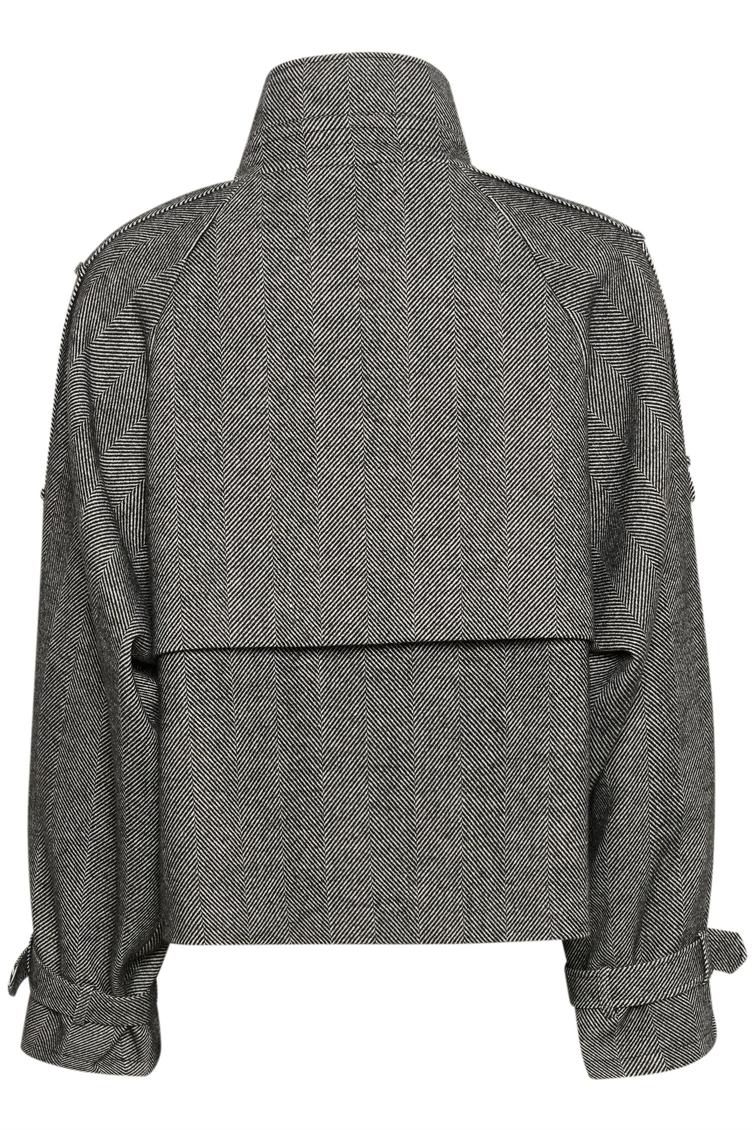 Kort, dobbeltspent jakke med høy, justerbar krage og beltekanter på ermene. Strukturell passform med subtil fiskebensvev for et sofistikert, skreddersydd uttrykk. Modellen er 178 cm høy og har på seg størrelse S/36.