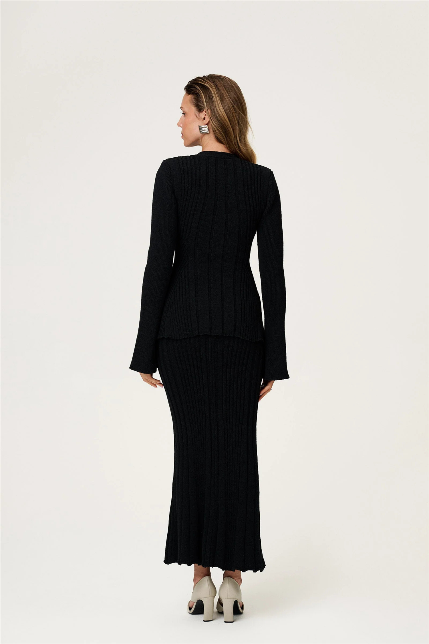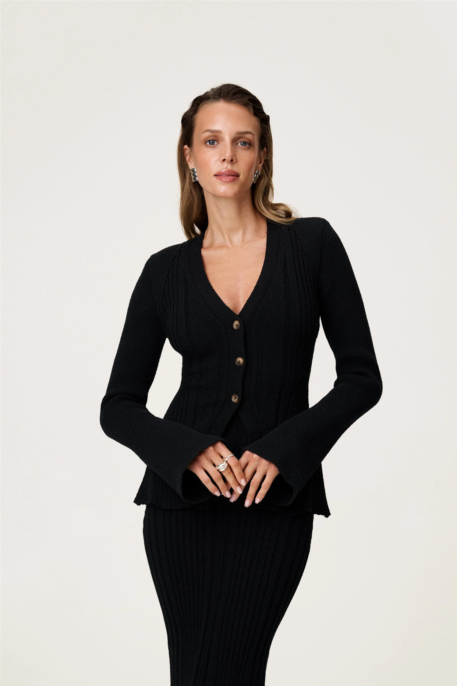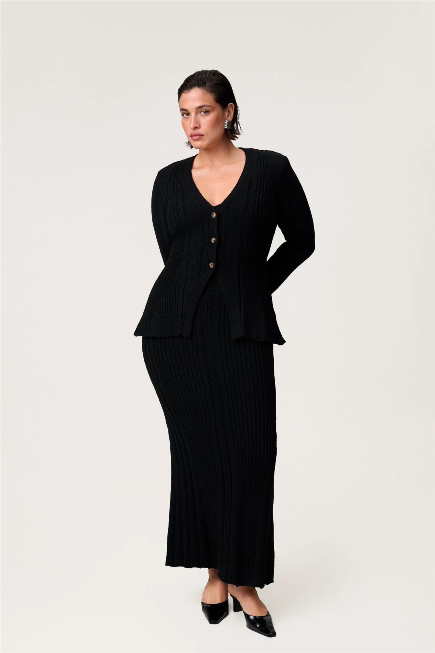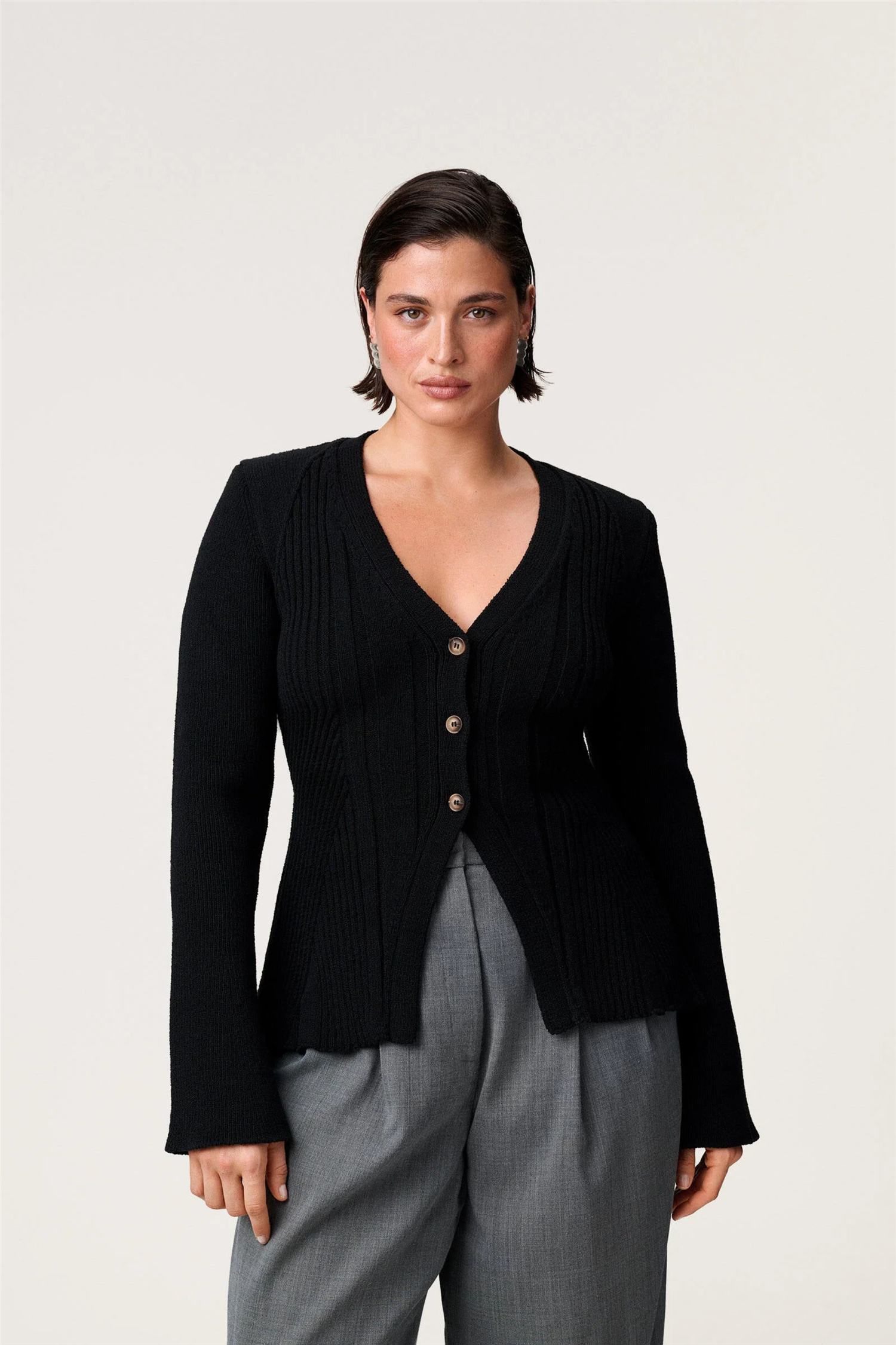 En oppdatert versjon av en favoritt – Lugo cardigan i sort kombinerer eleganse med komfort. Den har strukturerte skulderputer og en markert midje som skaper en sofistikert silhuett. De lange ermene avsluttes med brede mansjetter for et raffinert uttrykk, mens det oppdaterte materialet gir enda bedre komfort enn tidligere sesonger.