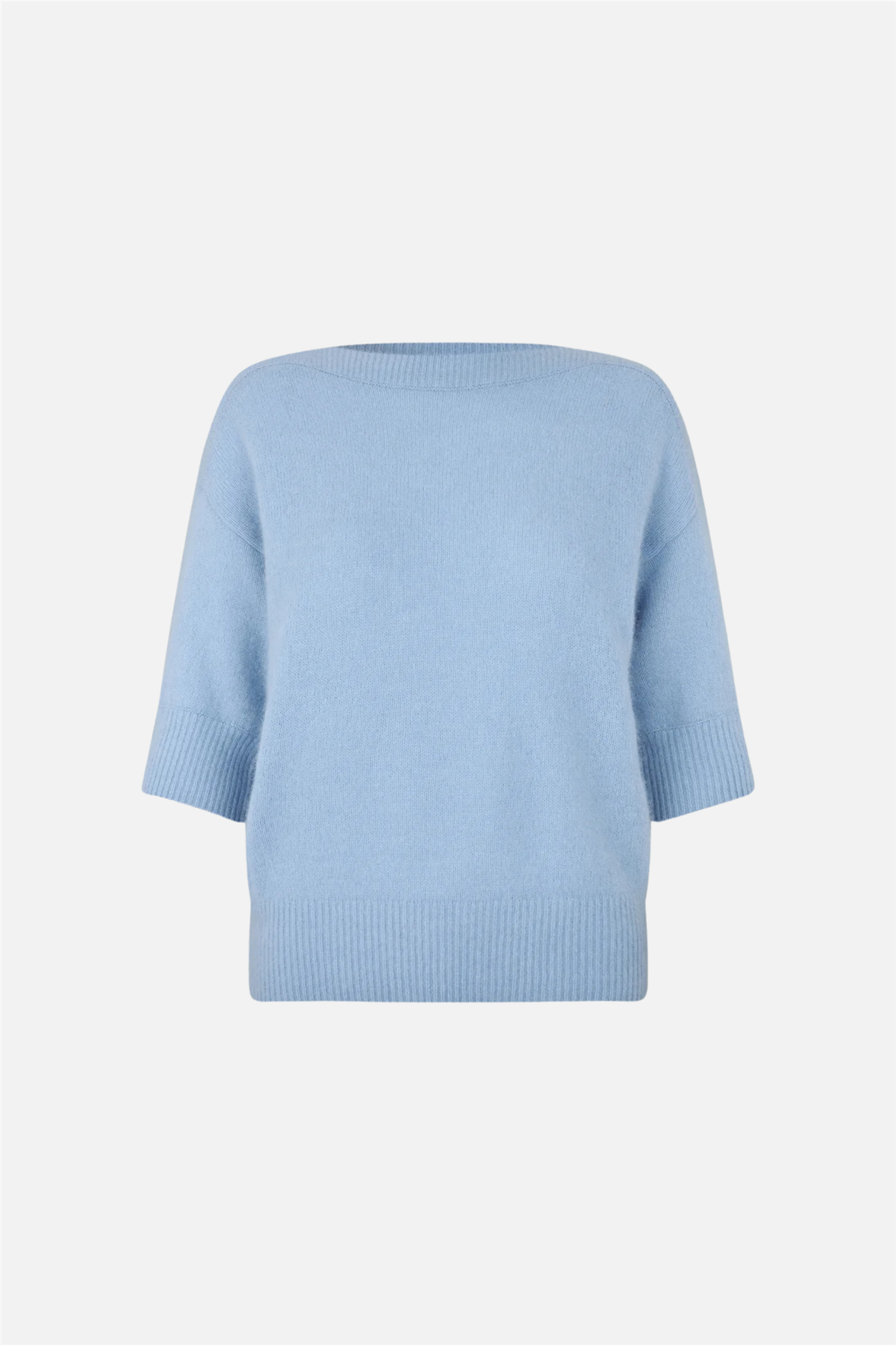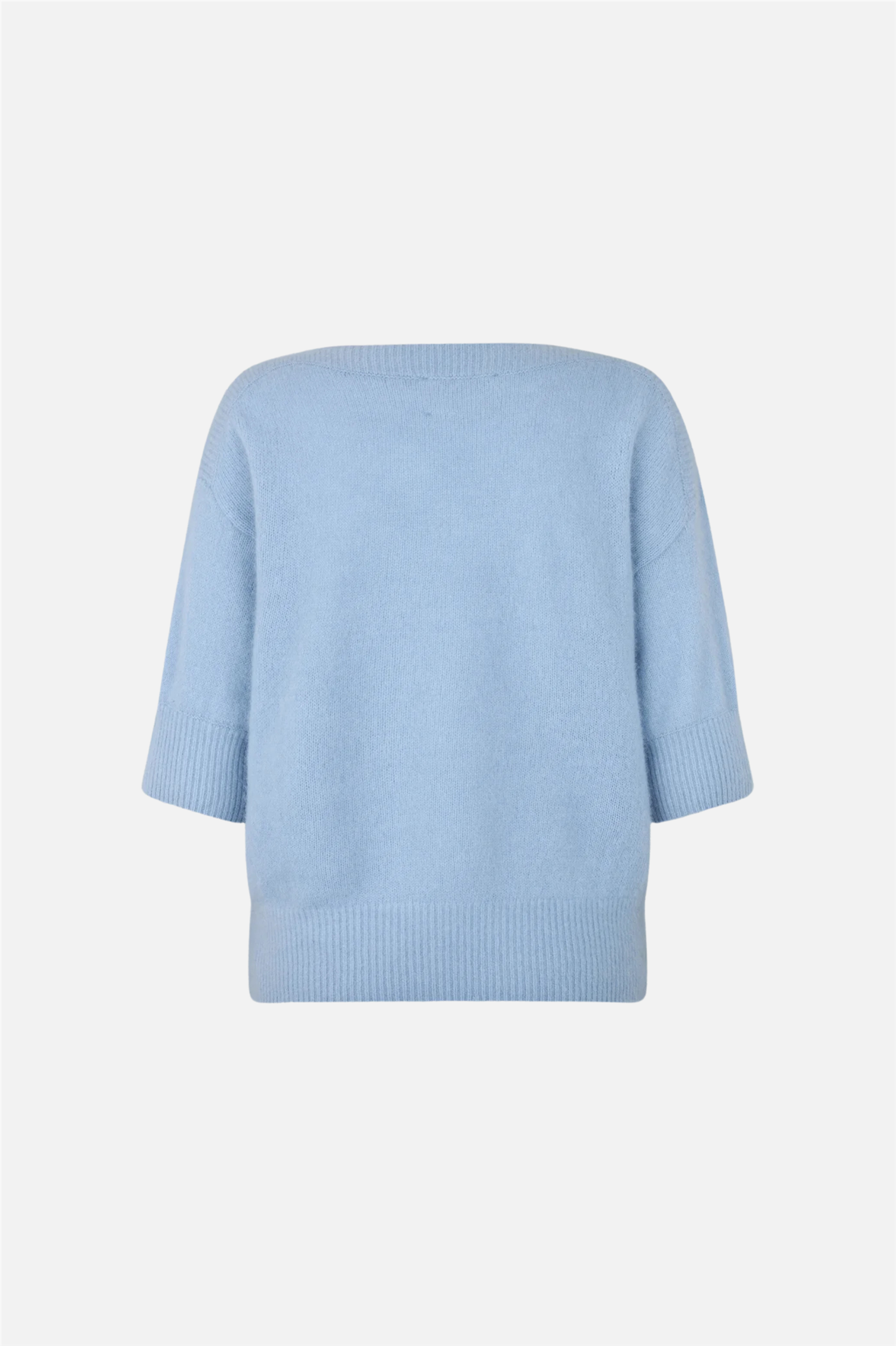 Moi fra Six Ámes. Moi er en løs genser med elegant båthals og 1/2-ermer. Den har ribbede detaljer i halsen, nederst på kroppen og mansjetter. Den har en normal passform og er laget av mykt, lett materiale med gode isolerende egenskaper, som holder deg varm i kaldt vær.