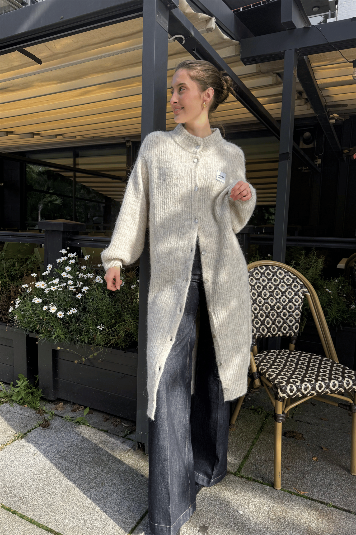 East Cardigan, en elegant mellomlang cardigan med knapper foran, fra American Vintage. Denne cardiganen kombinerer komfort og stil med sin myke følelse og varme. Perfekt som et lagplagg – bruk den over basic t-skjorte eller under kåpe, alt etter vær og anledning. Fargen “Powder Snow” gir et lyst, delikat uttrykk som lett matcher med både mørke jeans og lysere bukser eller skjørt.