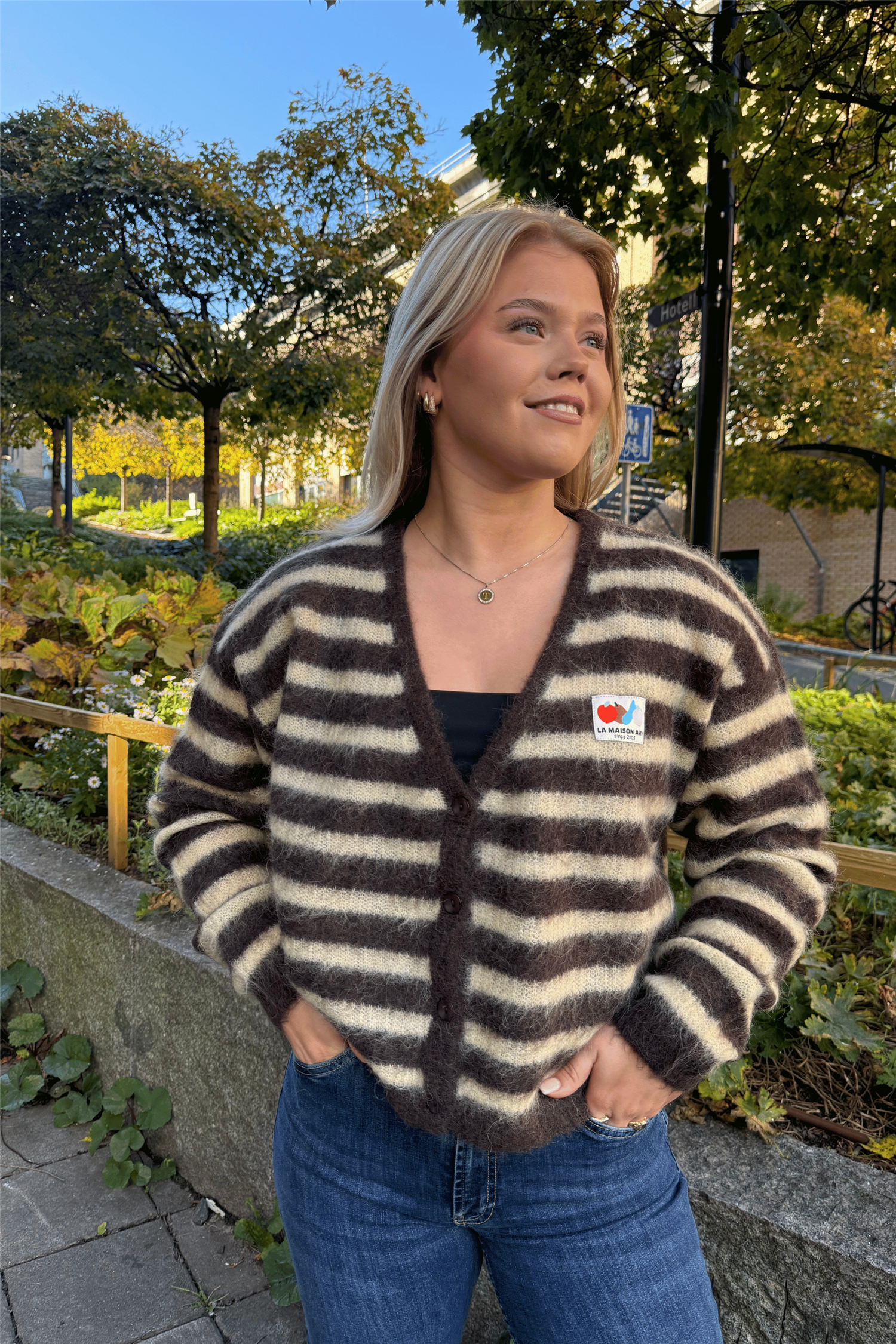 Langermet cardigan V-hals med knapper. Myk strikk med et luftig utseende. Myk og lett følelse. Brystlapp med «La Maison AMV»-logo