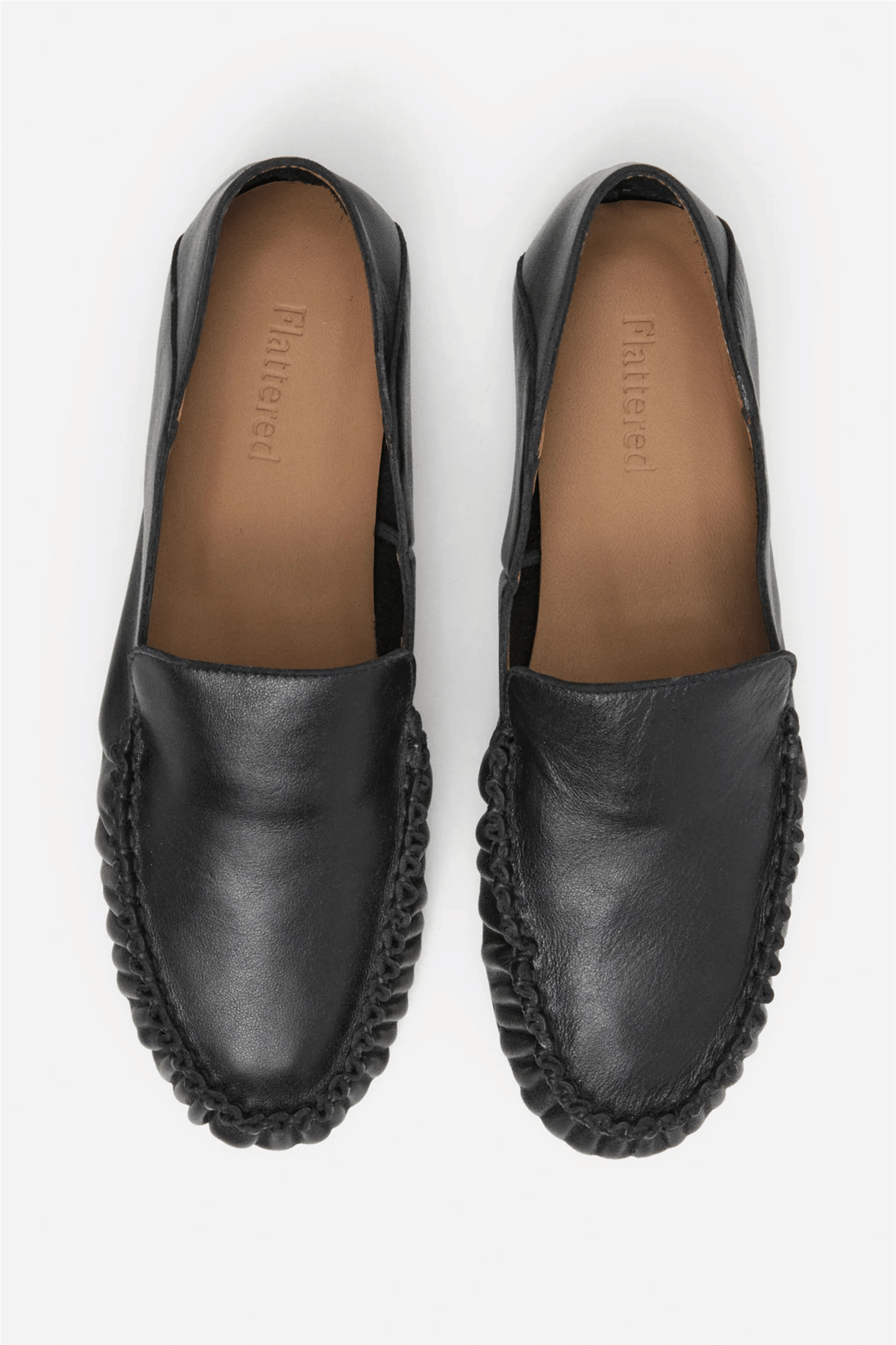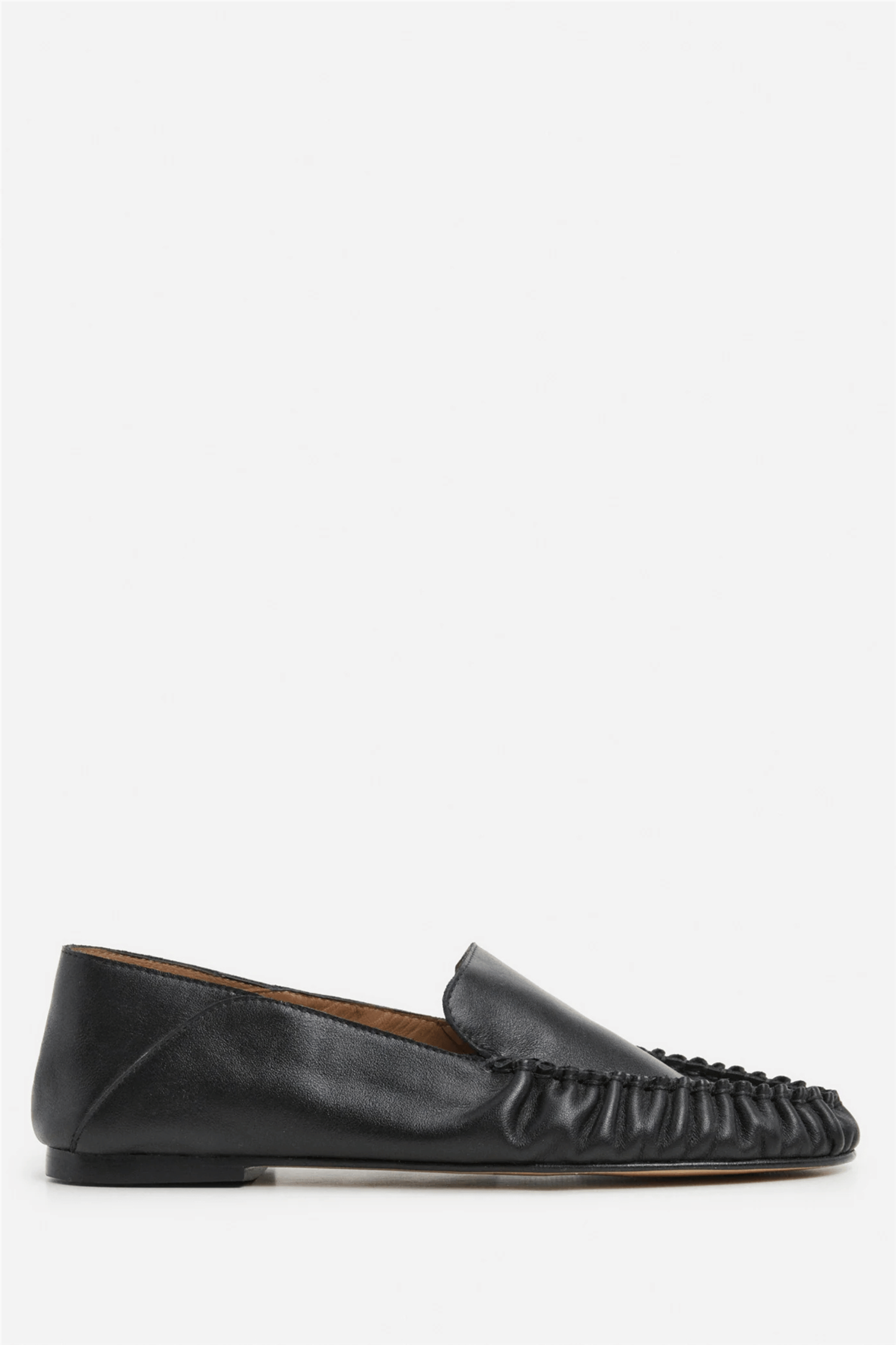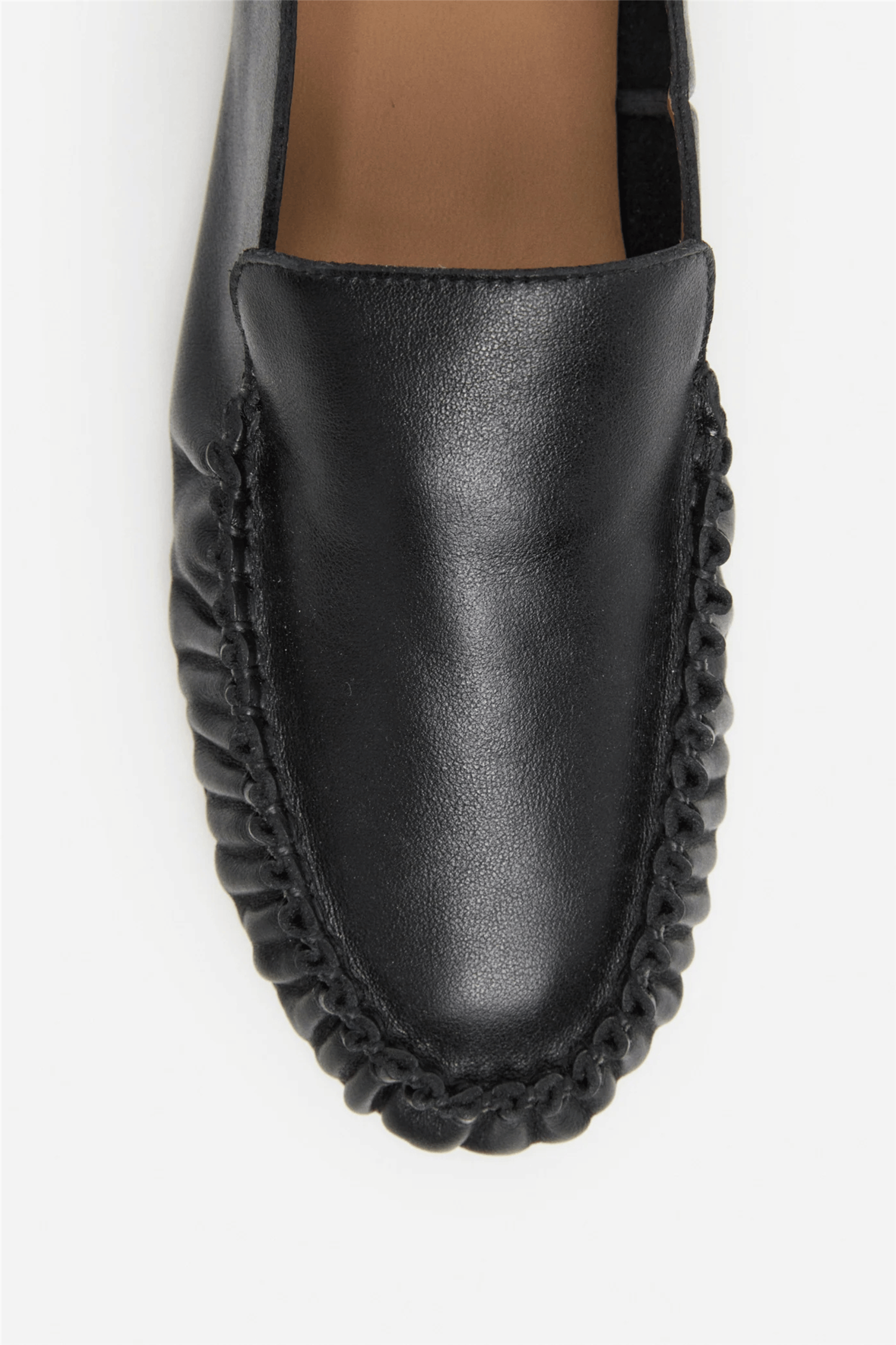 Bon Bon er en myk og allsidig loafer laget i glatt skinn, med dekorative folder / rynker ved tåen som gir et feminint og teksturert uttrykk. Den har en fleksibel hælkappe som kan skyves ned, slik at du kan bruke den som en klassisk loafer eller som en slippers. Dette gjør modellen ekstra komfortabel og praktisk.