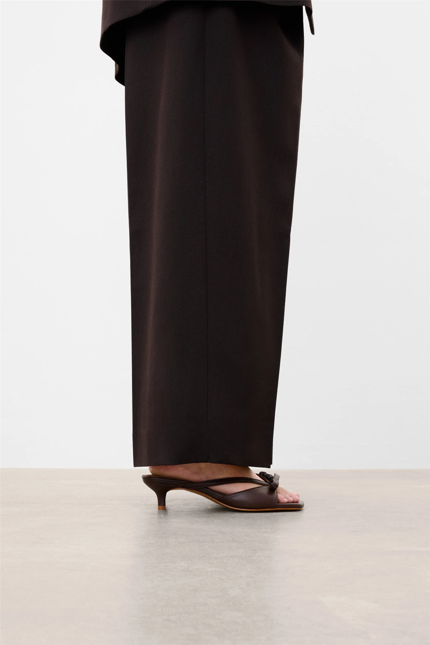 Jordan Leather fra Flattered er en feminin og elegant sandal med lav hæl som kombinerer komfort og et tidløst uttrykk. Jordan Leather fra Flattered er laget i glatt skinn i en dyp sjokoladebrun tone som gir et varmt og eksklusivt preg, og den har en firkantet tå og smale remmer over foten som gir en lett og sofistikert silhuett. Den lille sløyfedetaljen foran tilfører det lille ekstra, mens den lave kitten heel-hælen gjør Jordan Leather behagelig å bruke gjennom hele dagen og kvelden. Den åpne slip-on fasongen gjør skoen enkel å ta av og på, samtidig som den sitter fint på foten. Jordan Leather fra Flattered er perfekt til sommerkjoler, dressbukser eller jeans, og fungerer like godt til hverdags som til middag ute – en skinnsandal med lav hæl du vil bruke igjen og igjen gjennom sesongen.