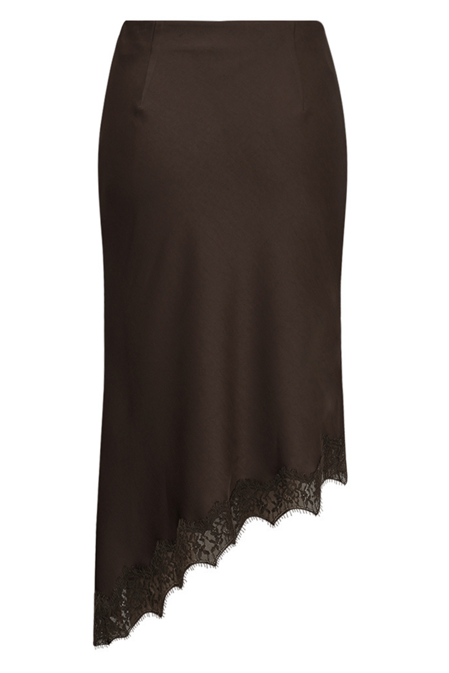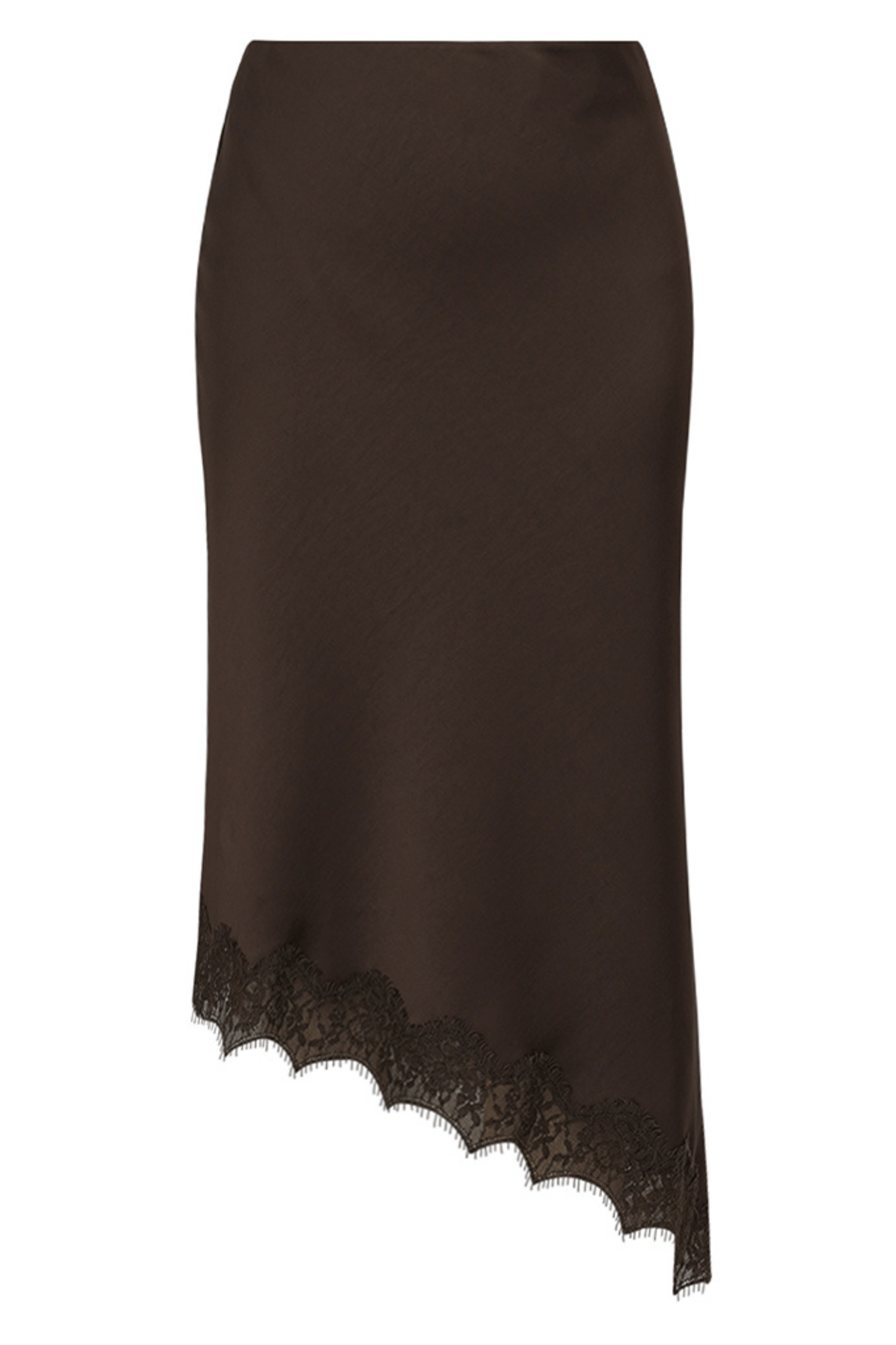 AmaraGO Skirt fra Gossia er et sofistikert brunt satengskjørt med asymmetrisk snitt og delikate blondekanter. Skjørtet har en elegant silhuett som både kan brukes alene eller styles trendy over bukser for en mer edgy look. Den luksuriøse satengfinishen og blondedetaljene gjør skjørtet til et perfekt partyskjørt – ideelt til julebord, nyttårsfest eller andre spesielle anledninger. Kombiner det med en enkel topp for hverdagsbruk, eller med Ember Go Top for et komplett og festklart antrekk.