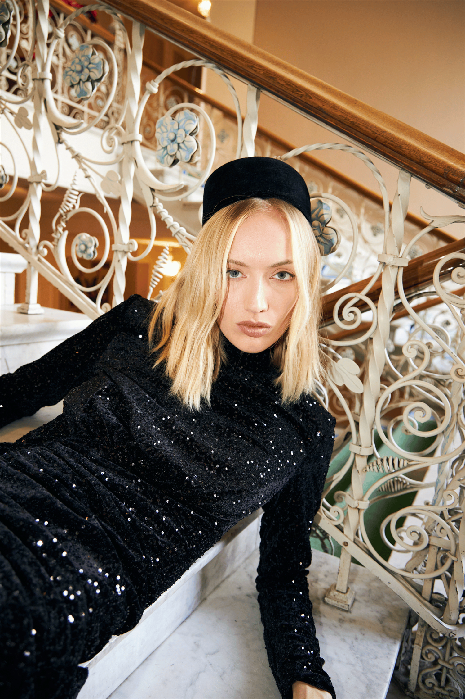 Glorycras Dress i sort er en sofistikert og drapert kjole i myk velour – ideell som elegant kjole til høytider og spesielle anledninger. Den høye halsen og de lange ermene gir et raffinert uttrykk, mens draperingen foran definerer midjen og gir en flatterende silhuett. Den dype frontslidsen tilfører et moderne og sensuelt preg, uten at komforten går på bekostning. Perfekt valg for deg som ønsker et uttrykk som både er glamorøst og tidløst.