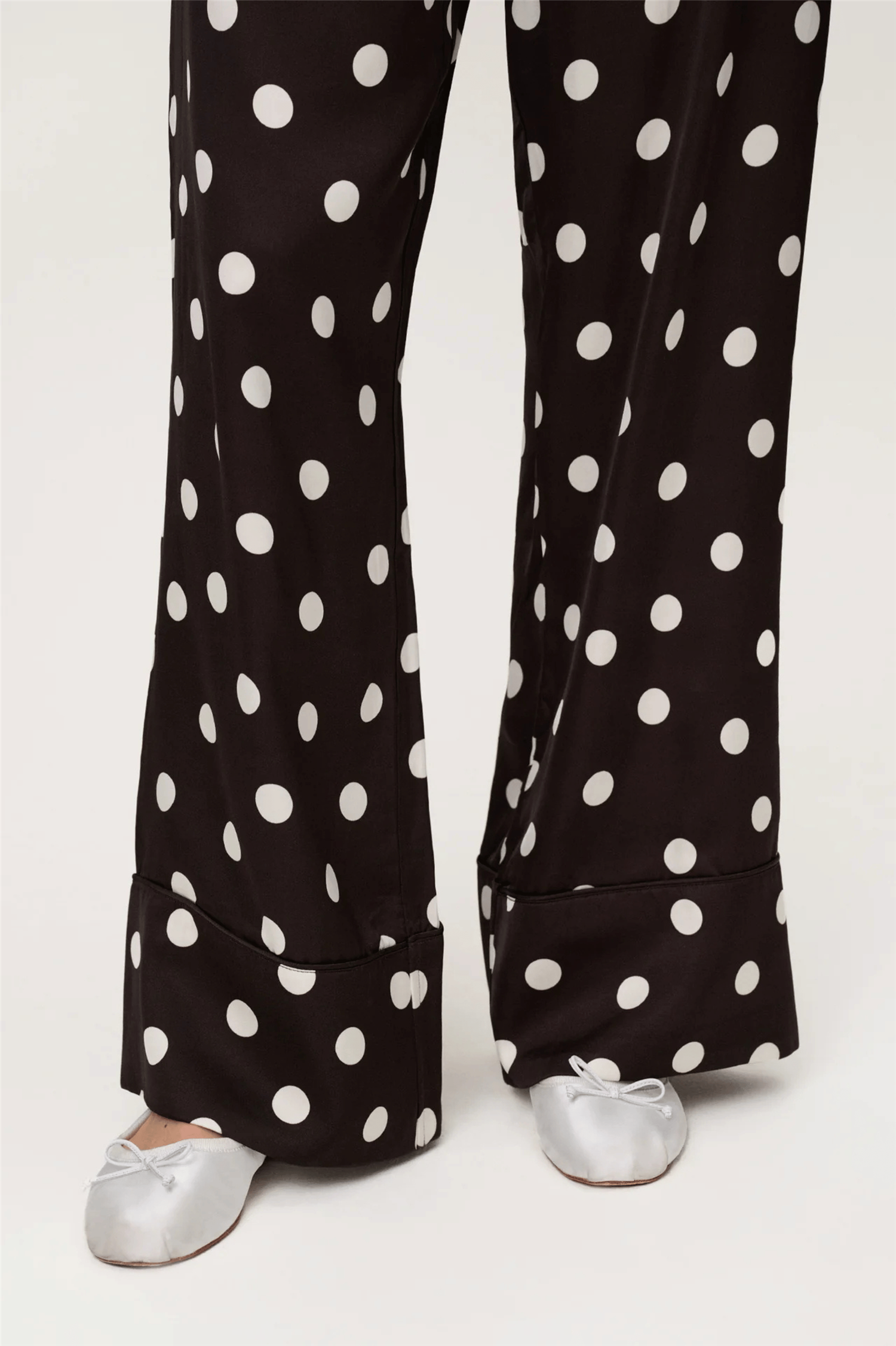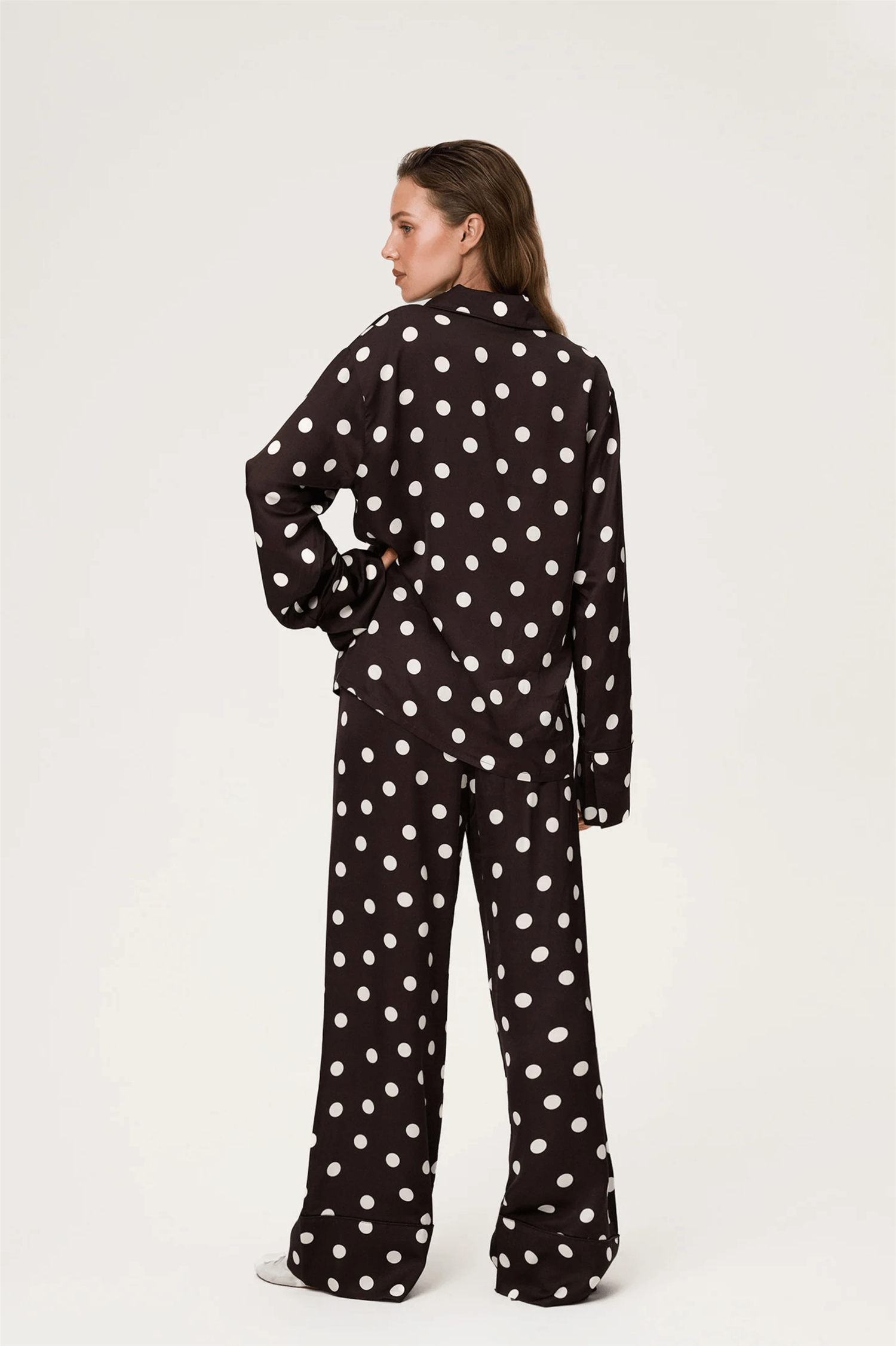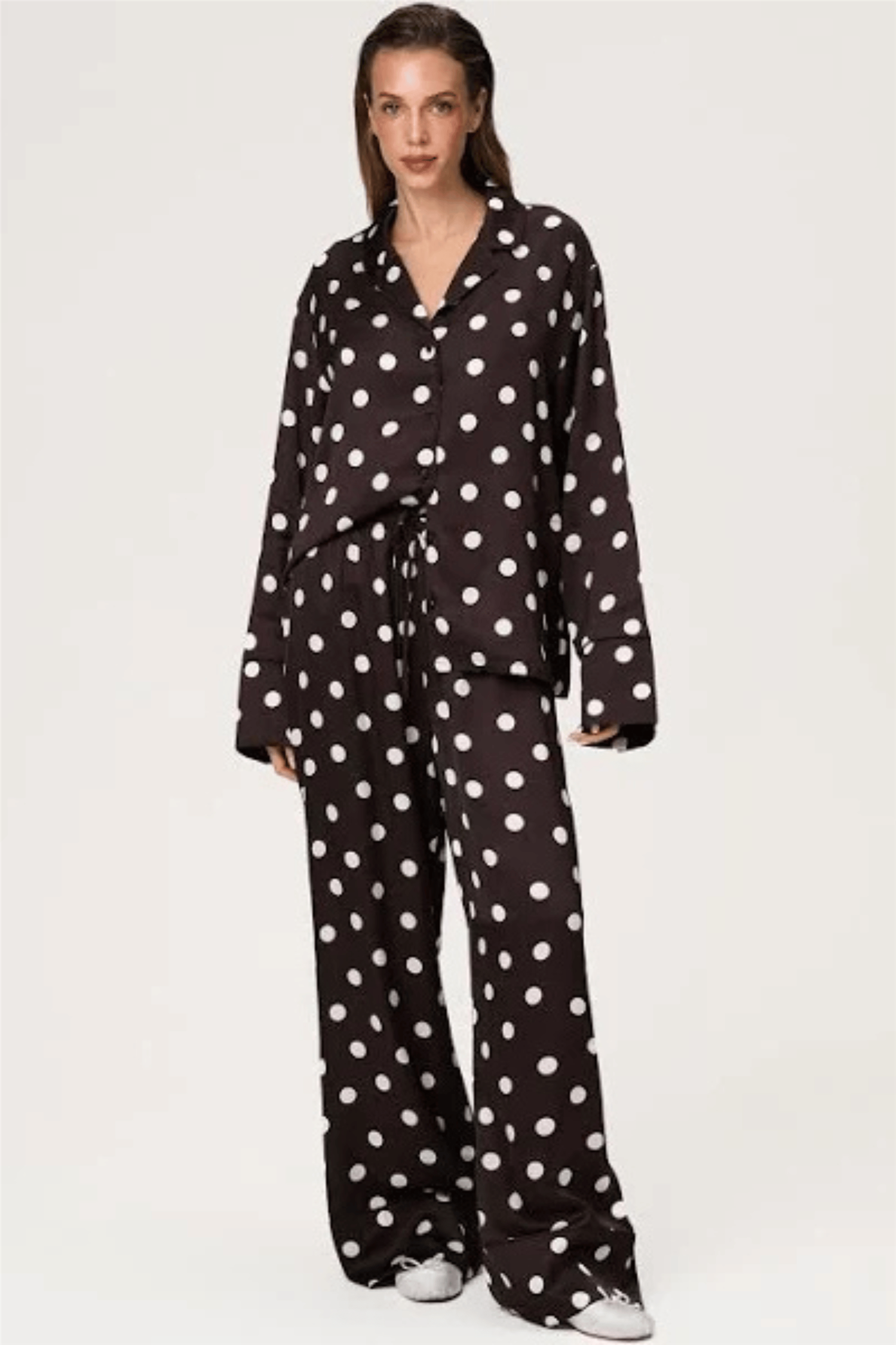 Aspen pysjamas-settet består av en langermet pysjamasskjorte og matchende bukser i full lengde, begge laget i et glatt, satenglignende materiale. Skjorten har resort-krage, kant i kontrastfarge, knepping foran og en diskret splitt i mansjetten for en feminin finish. Buksene har en komfortabel strikk i midjen for en avslappet og behagelig passform.
