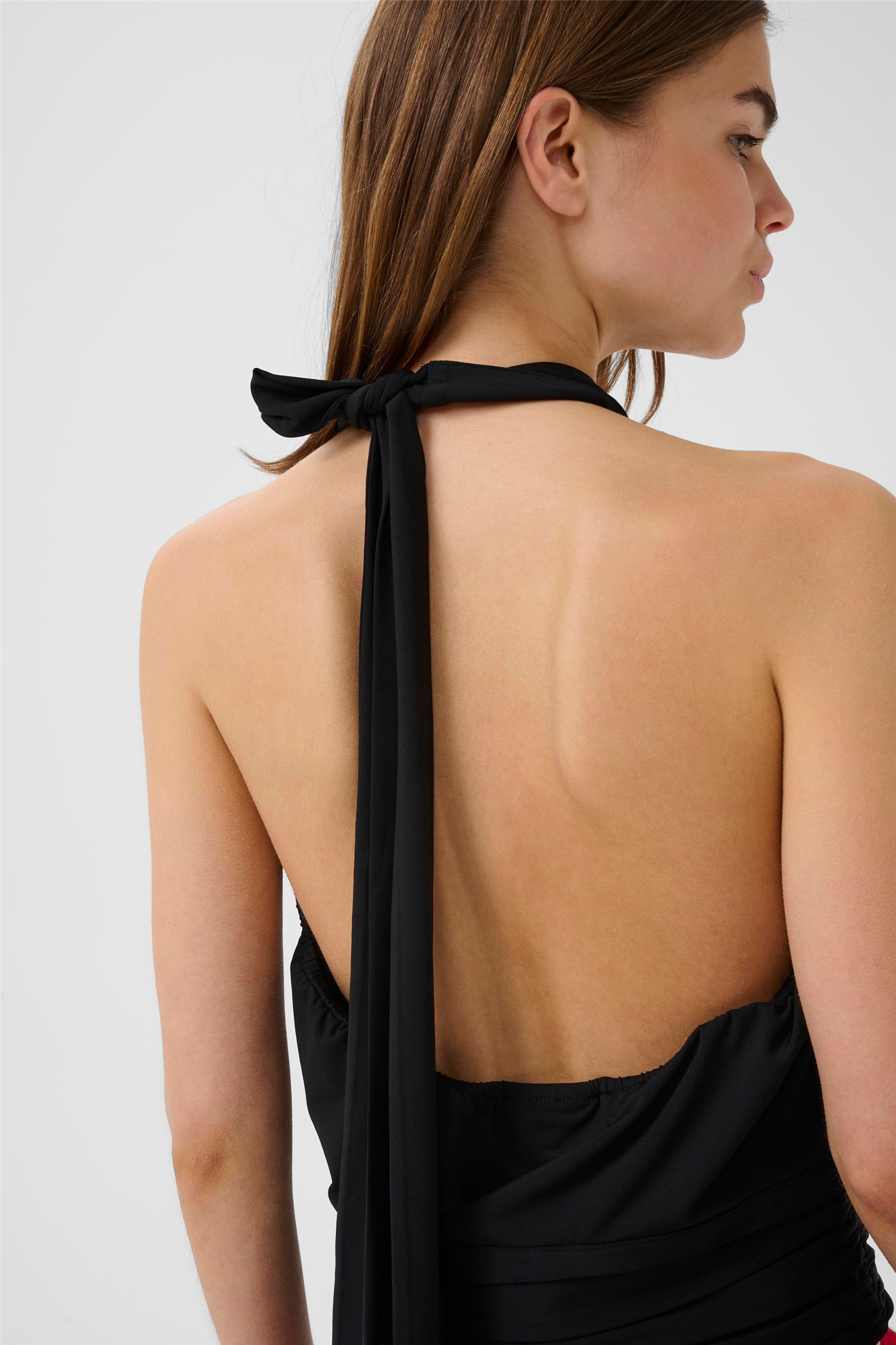 GZkadie Top er en feminin og iøynefallende halterneck-topp med åpen rygg som gir en elegant, men samtidig selvsikker silhuett. Den høye halsen og de myke draperingene i front skaper et sofistikert uttrykk, mens den markerte midjen fremhever formen på en flatterende måte. Den knytes i nakken og gir en vakker, åpen rygg som virkelig gjør hele looken. GZkadie Top fra Gestuz kommer i både sort og rød, og fungerer like fint til dressbukser og hæler for en kveld ute som til jeans for en mer avslappet, men gjennomført styling – en topp som garantert blir lagt merke til.