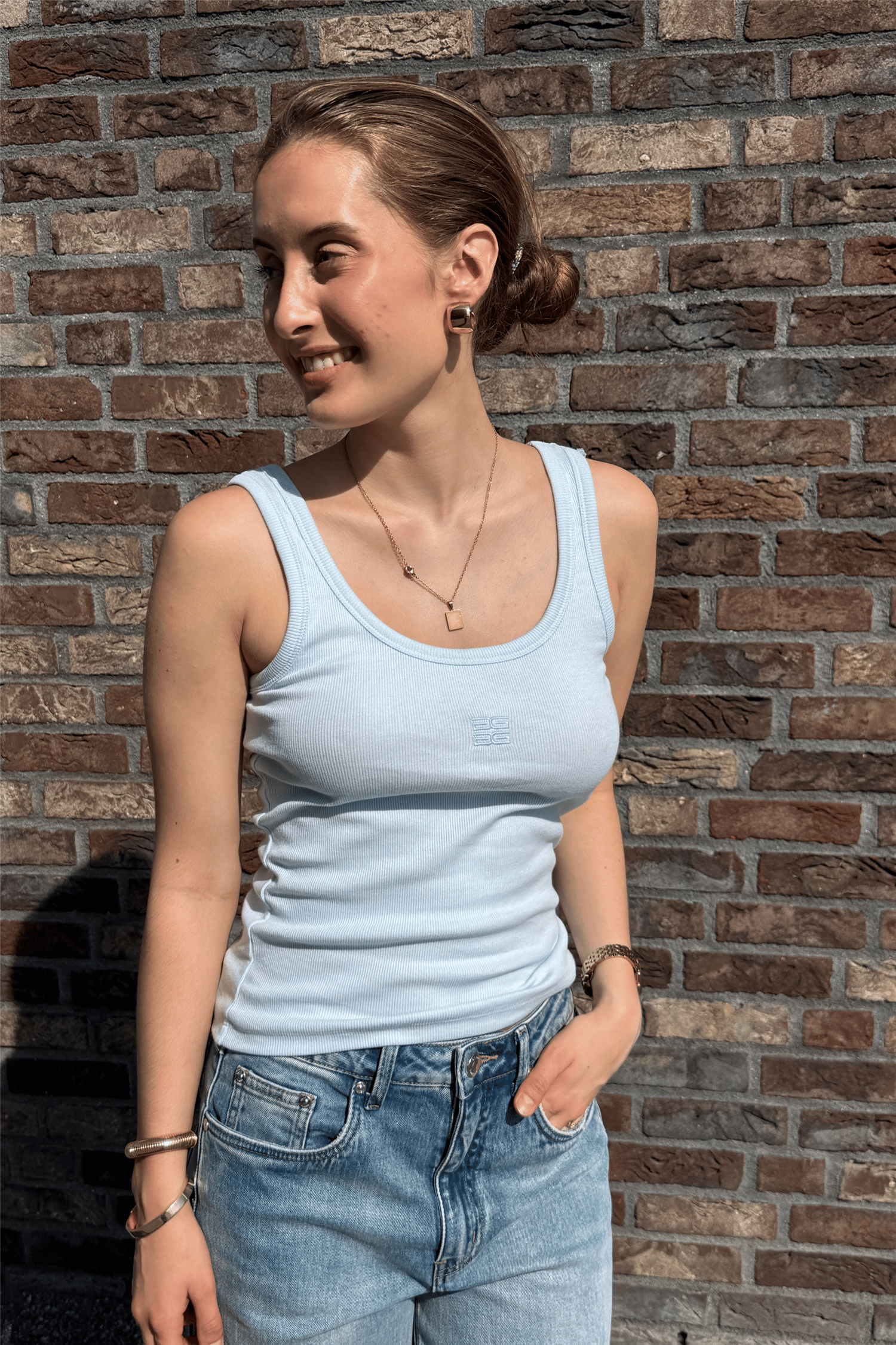Gzdrew Logo Top 2.0 fra Gestuz i blue finch er en klassisk og allsidig singlet i tidløs hvit farge. Denne toppen er laget i en myk og elastisk bomullsblanding med ribbet struktur, som sikrer en behagelig og flatterende passform. Designet kjennetegnes av en dyp rund hals og brede skulderstropper, noe som gir et tidløst uttrykk perfekt for både hverdagsbruk og lag-på-lag. En diskret, brodert logo midt på brystet tilfører et snev av eksklusivitet, mens den klassiske fargen gjør den enkel å style.