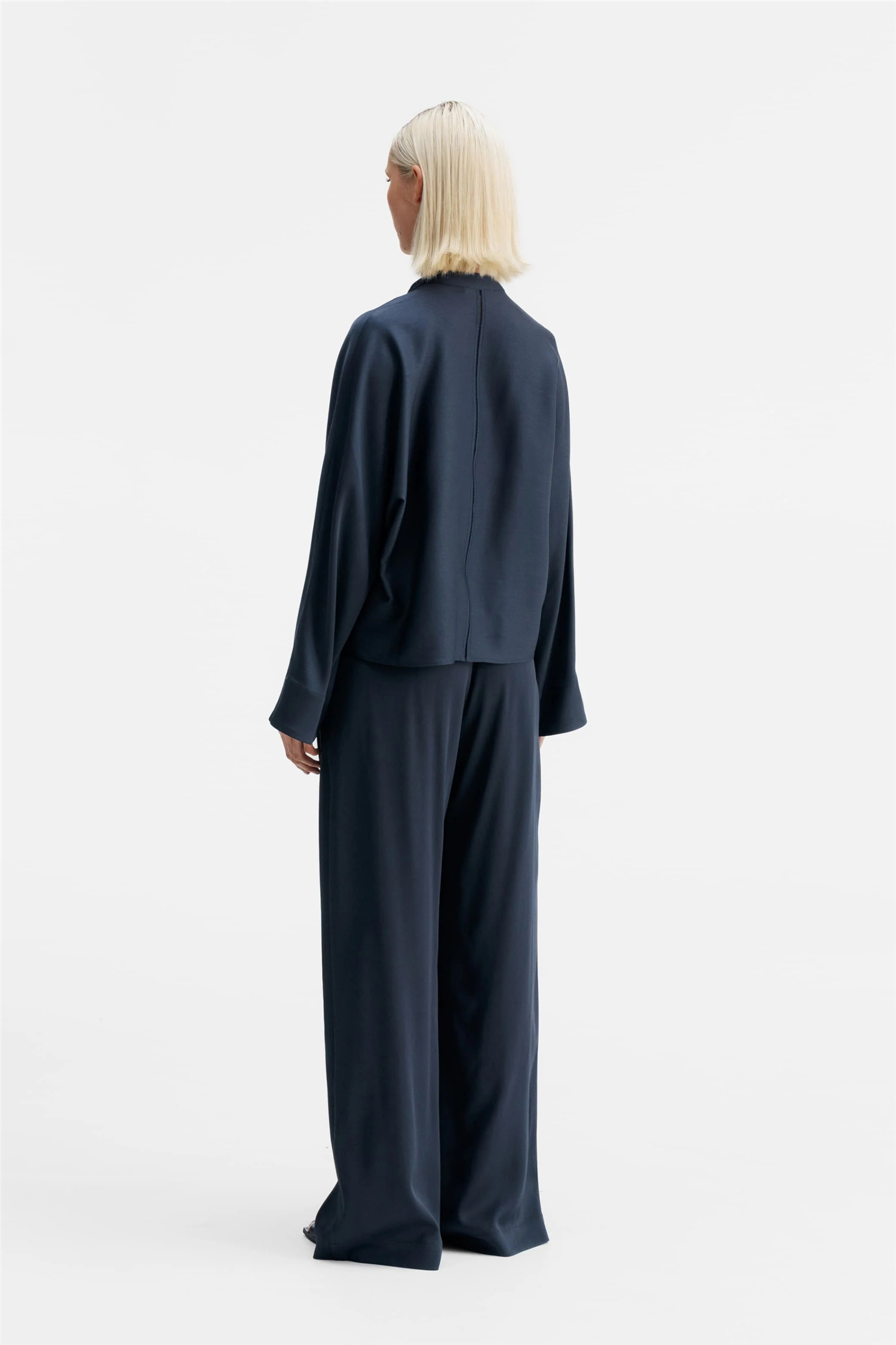 Mila Trousers er en elegant bukse i en eksklusiv acetatblanding med crepe de chine-overflate som gir et mykt og sofistikert fall. Den sitter høyt i midjen og har rette, lett avslappede ben som skaper en flatterende og moderne silhuett. Mila Trousers har sidelommer, glidelåsgylf med skjult trykknapp og beltehemper i midjen som gir et rent og gjennomført uttrykk. Style Mila Trousers med en strikkegenser eller en oversized T-skjorte for en avslappet hverdagslook, eller kombiner den med en silkebluse for en mer oppdresset følelse – en allsidig favoritt fra Ahlvar Gallery du kan bruke sesong etter sesong.