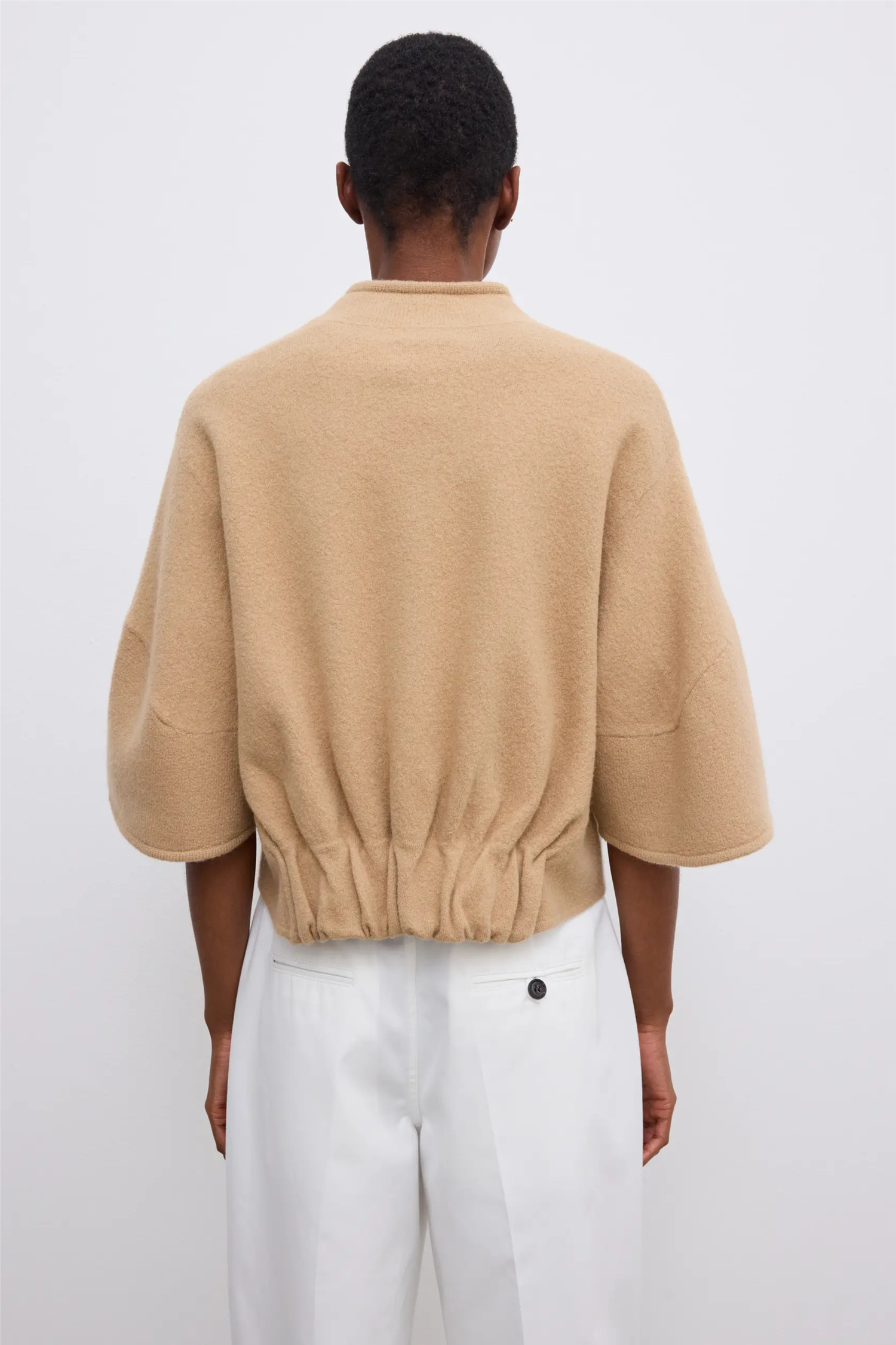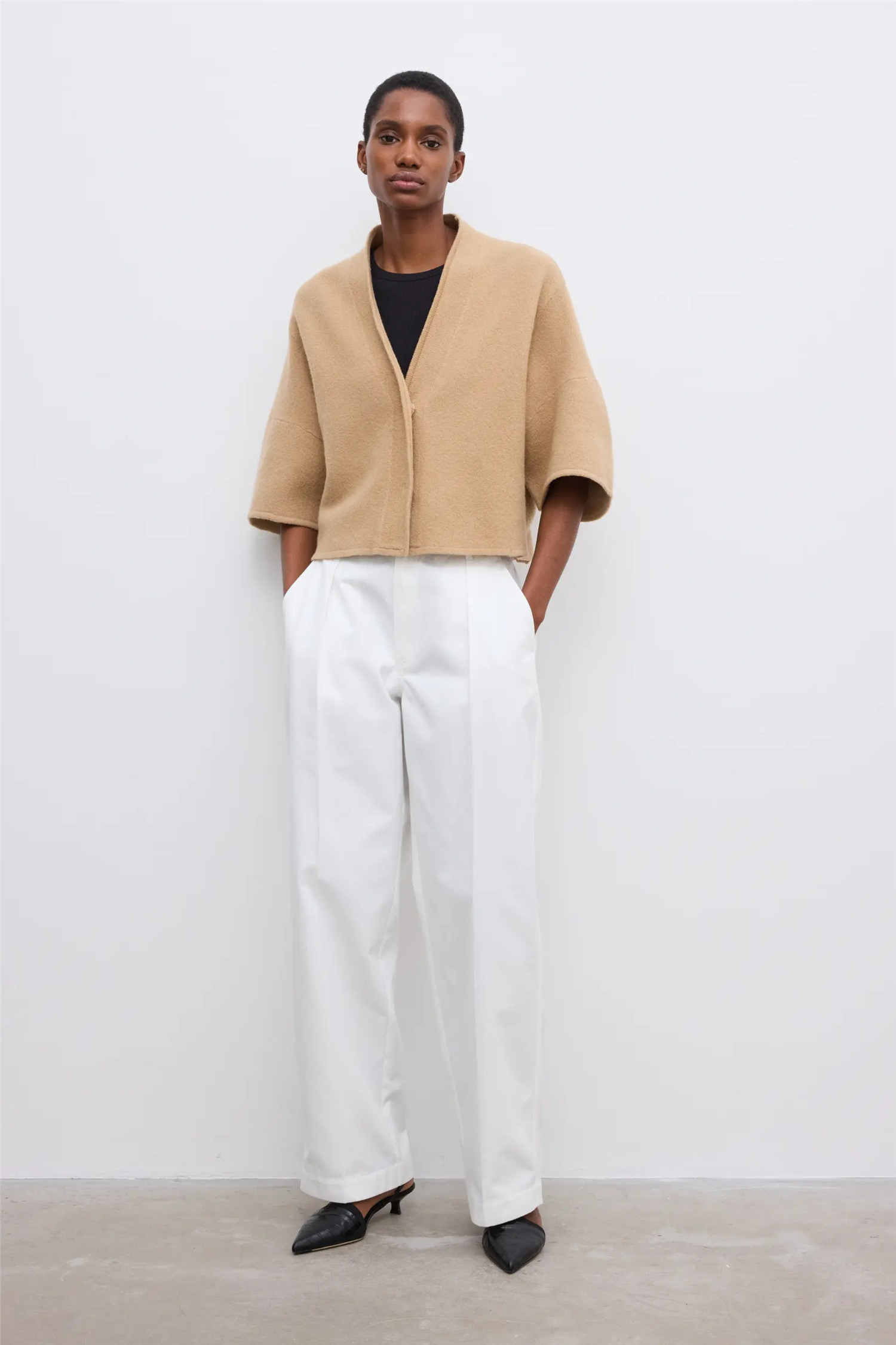 Short Wool Cardigan fra Dagmar er en tidløs og elegant cardigan laget i 100 % mulesing-fri merinoull av høy kvalitet. Den har en flatterende V-hals og en cropped lengde som gir et moderne uttrykk, samtidig som de avrundede, droppede skuldrene skaper en myk og avslappet silhuett. De skjulte knappene i front gir et rent og gjennomført design.